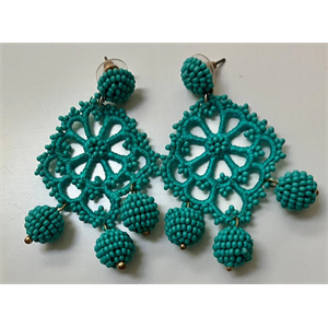 New Turquoise Wooden Fan Shaped Pierced Earrings.Great looking with large red beads. Measures 2 1/2” Long.
